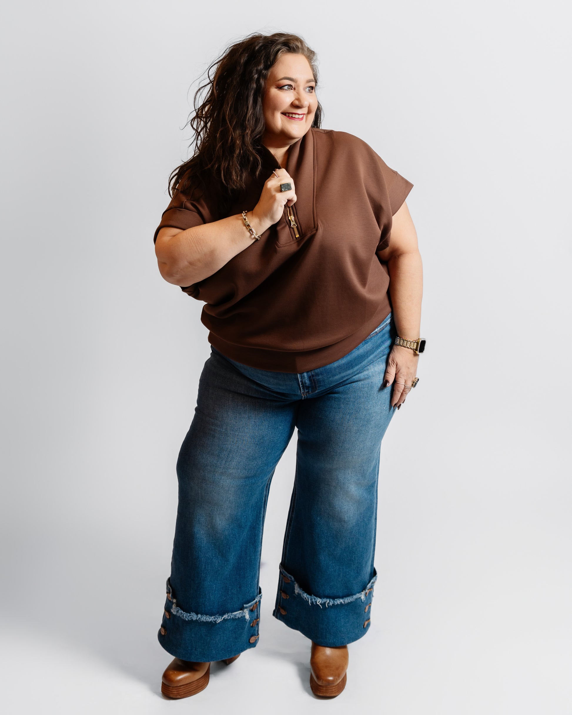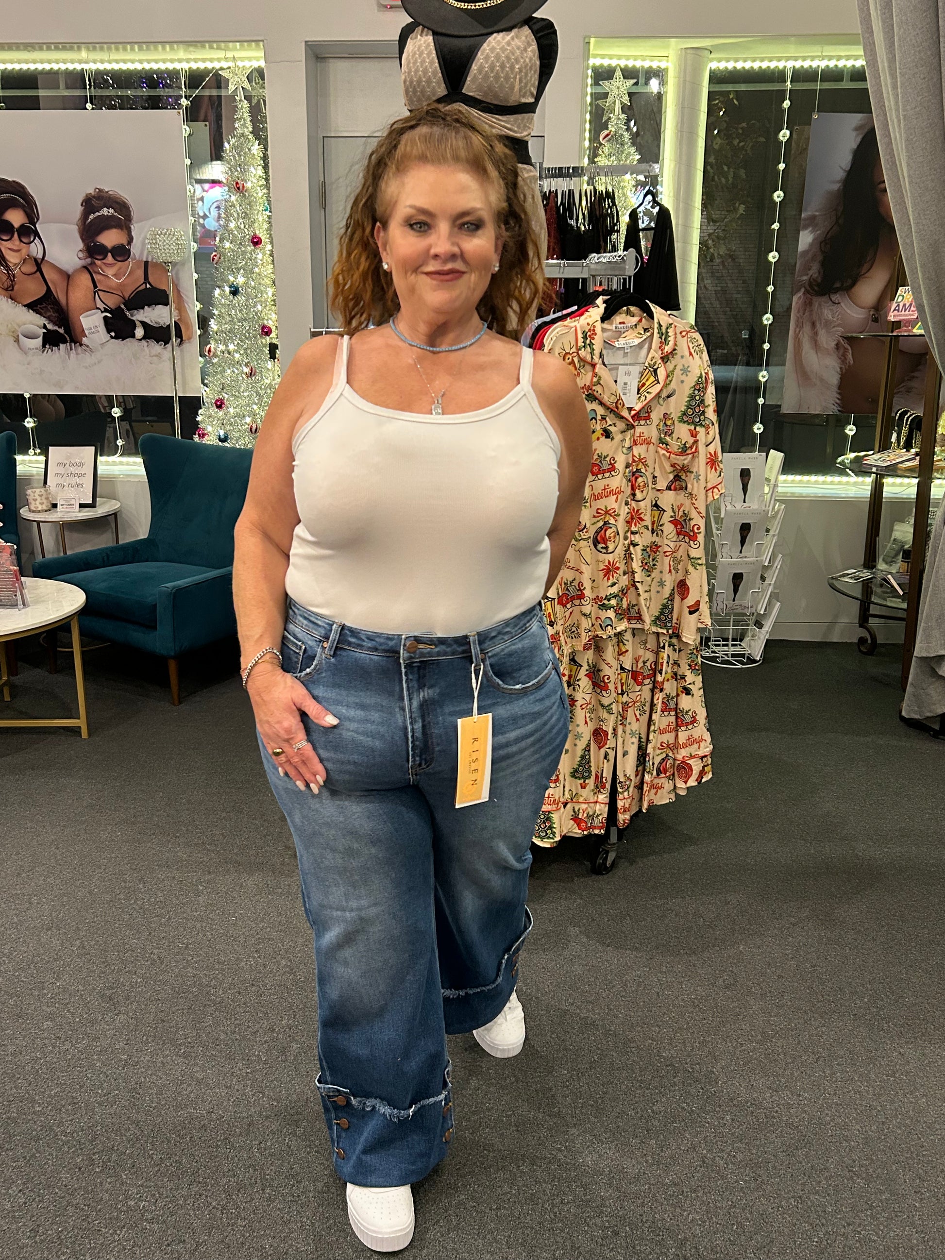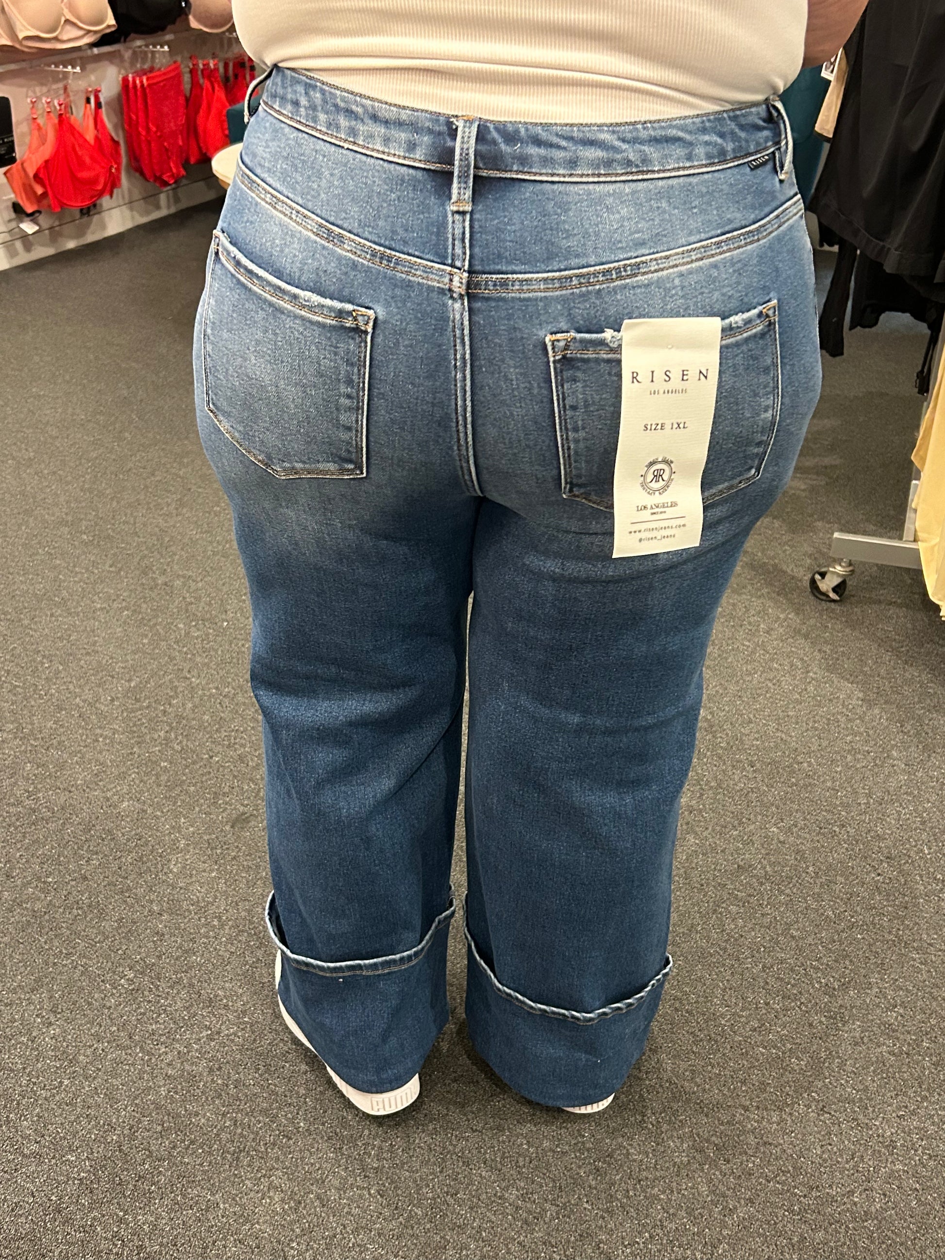 These high-rise medium wash wide-leg jeans deliver effortless cool with a playful cuff button detail that sets them apart. The cropped 28" inseam hits just right, while the relaxed silhouette flatters every frame. Perfect for styling with sneakers, loafers, or heels—this Risen pair brings that coveted vintage-inspired vibe with a modern twist. A wardrobe essential that works as hard as you do.