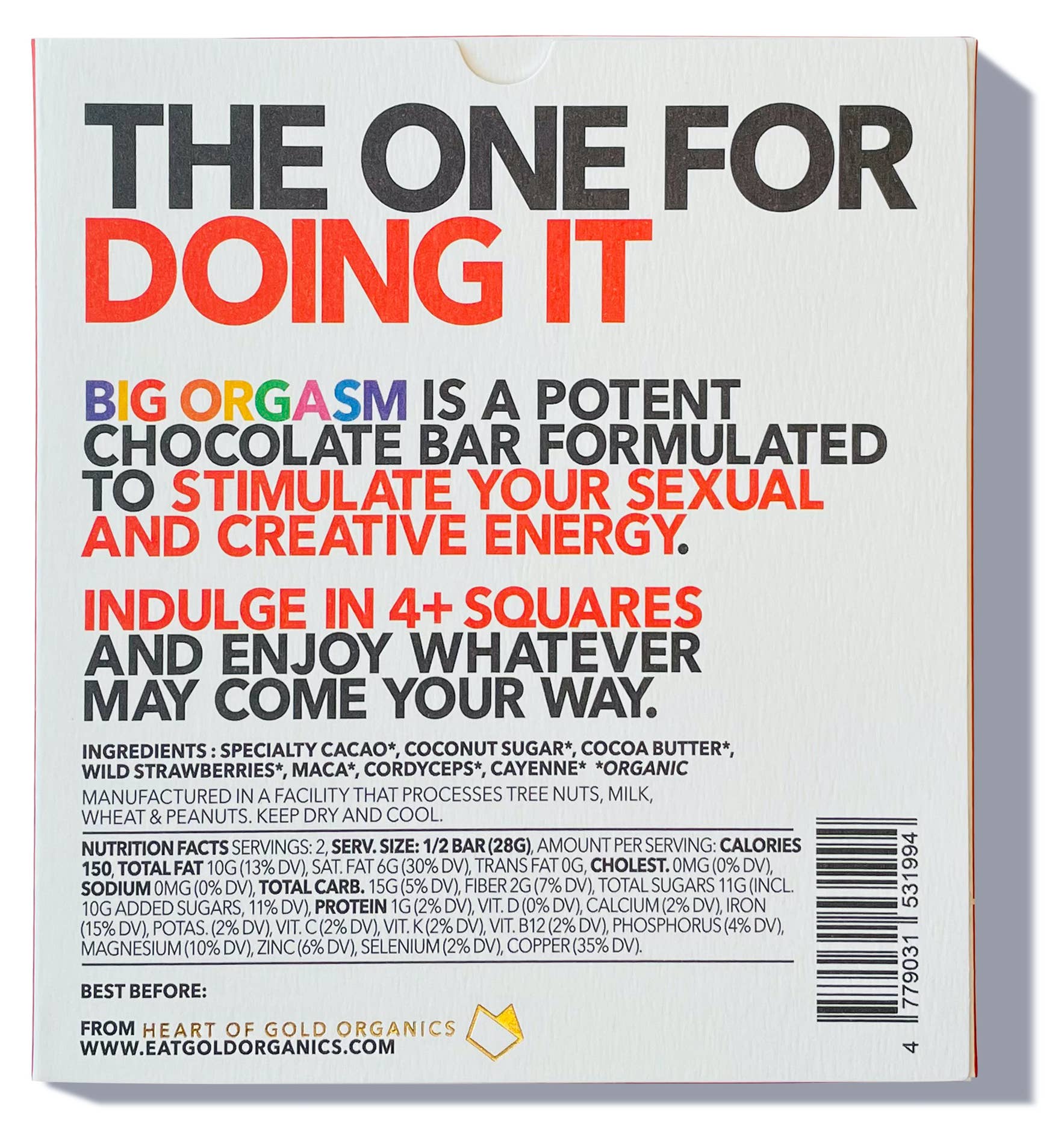Big Orgasm is a potent, functional chocolate bar formulated to increase libido & stimulate your sexual and creative energy. Indulge in 4+ squares and enjoy whatever comes your way. Valentine's Day Best Seller!!!