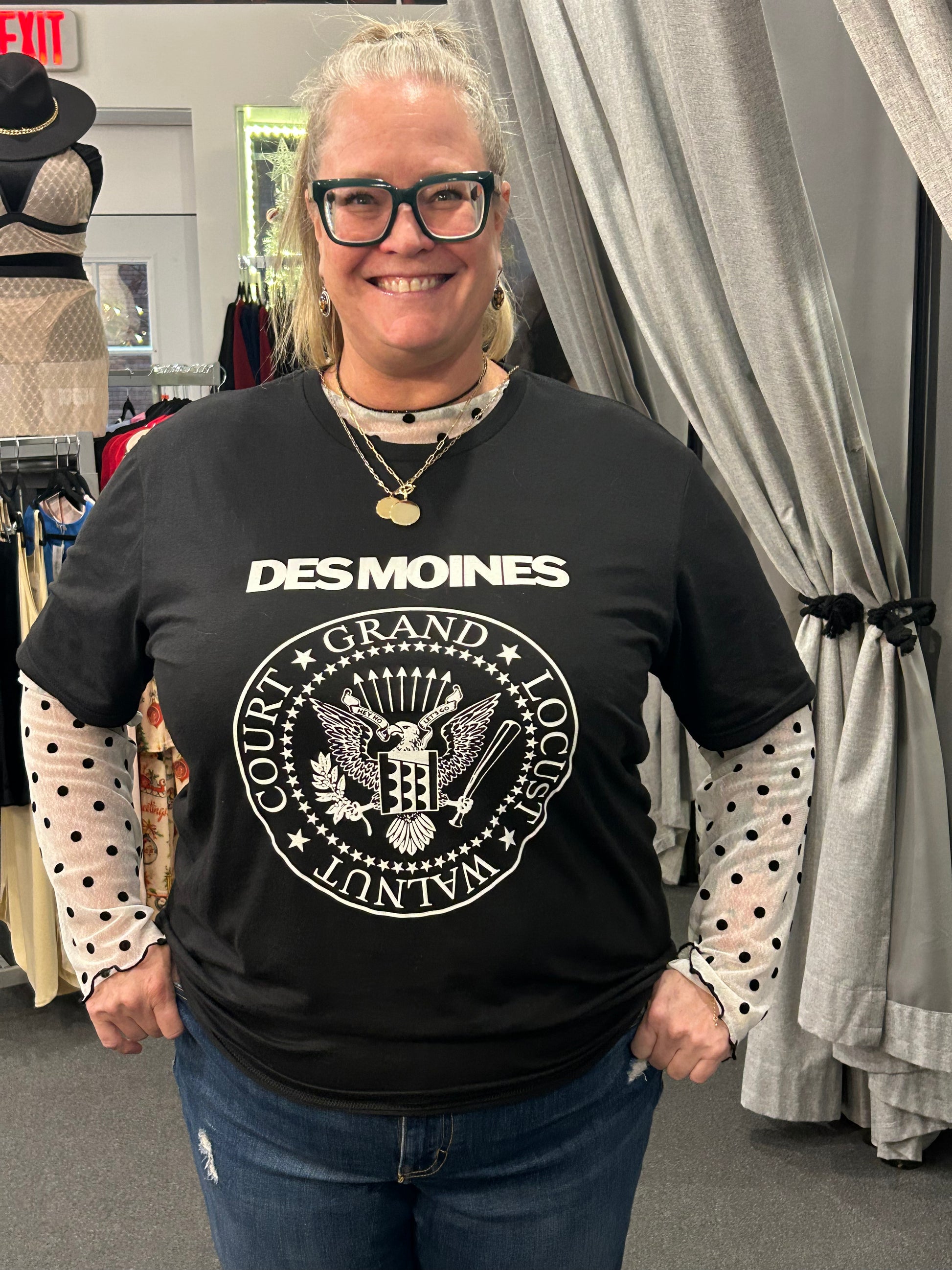 Rock the streets of Des Moines in this bold crew neck tee that channels vintage punk energy. Featuring a Ramones style take on the Des Moines seal with an edgy, rebellious twist, this local merch celebrates downtown culture and attitude. Short sleeves, classic fit, and that vintage vibe make it the perfect statement piece for anyone who lives and breathes the city. Wear it loud, wear it proud—this is Des Moines street style reimagined.