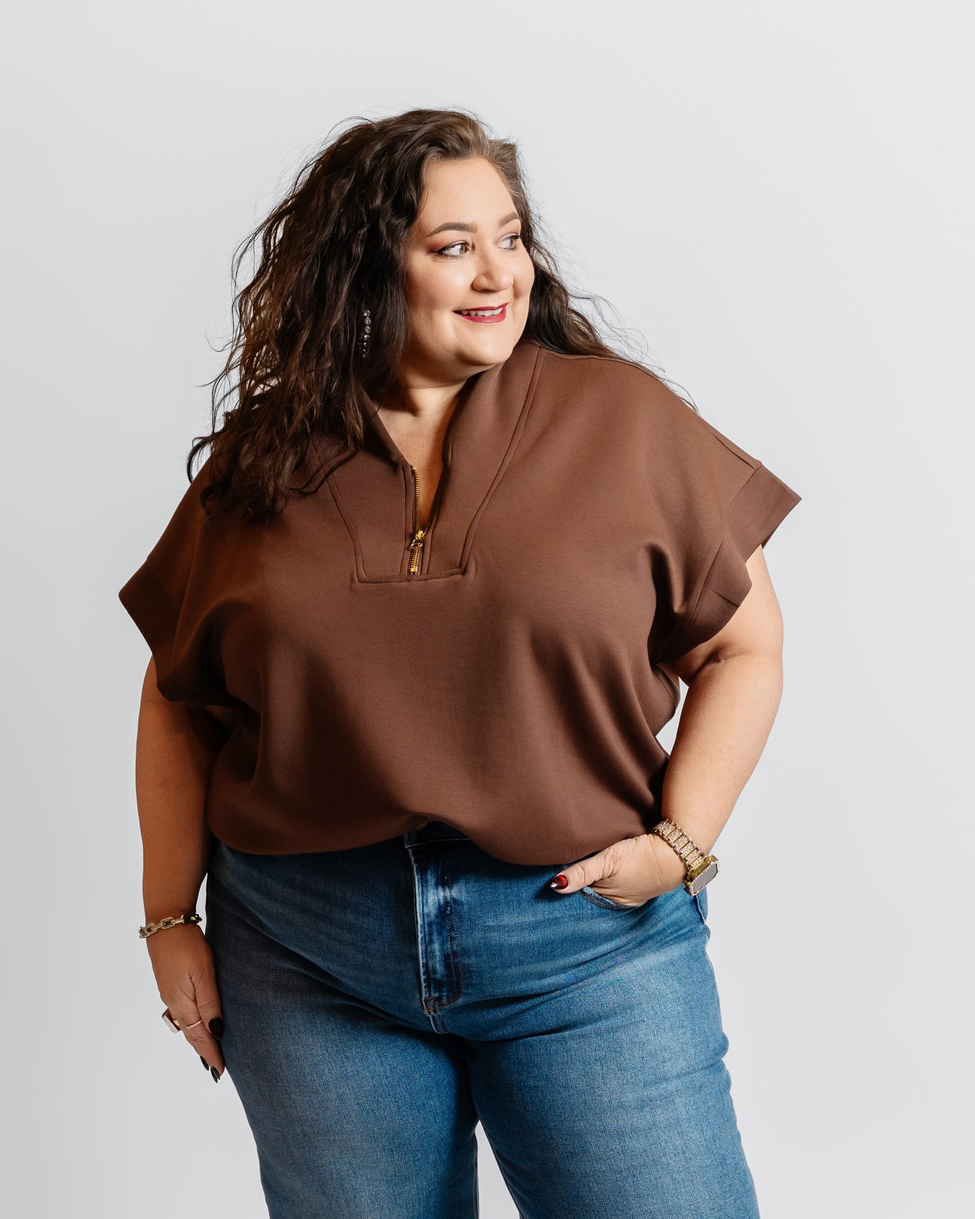 Experience unparalleled comfort with our Half Zip Scuba Sweatshirt, crafted from ultra-soft scuba material that feels gentle against your skin. Featuring a stylish high neck and a convenient half-zip design with a striking gold zipper detail, this short-sleeve sweatshirt offers a modern boxy fit for effortless layering and a chic silhouette. Perfect for elevating casual looks while keeping you cozy all day.