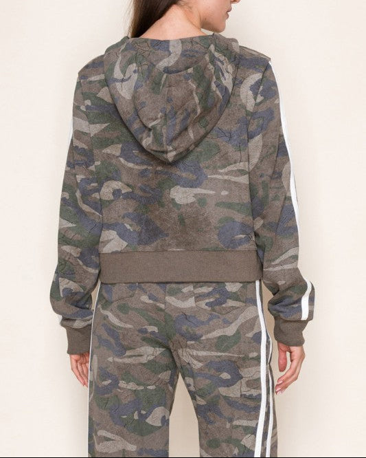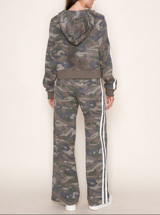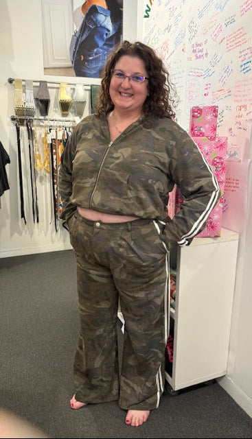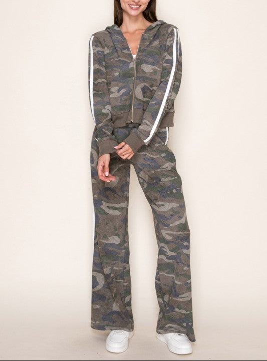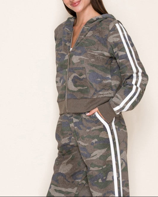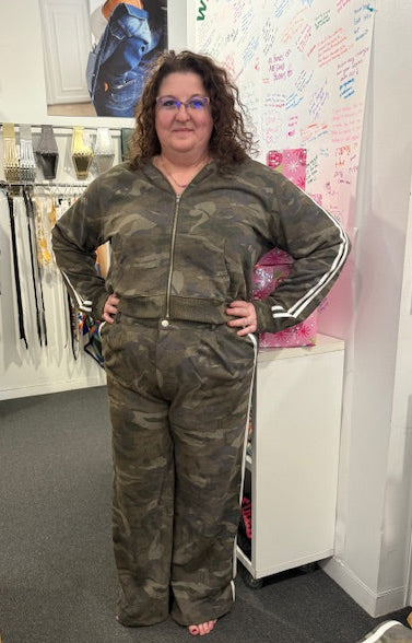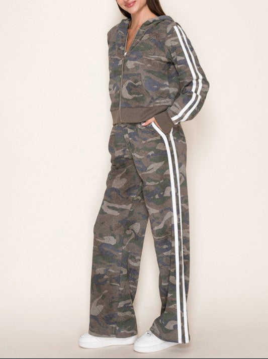 Discover your new go-to combo with this playful camo set that's equal parts cozy and cool. The zip-up hoodie features front pockets and a relaxed fit, while the high-waisted pants bring attitude with pleats and racer stripes down the sides. Both pieces are crafted from lightweight knit fabric that moves with you, making this set perfect for casual days when you want to look effortlessly put-together. True-to-size fit means no guessing game—just grab your usual size and you're ready to go.