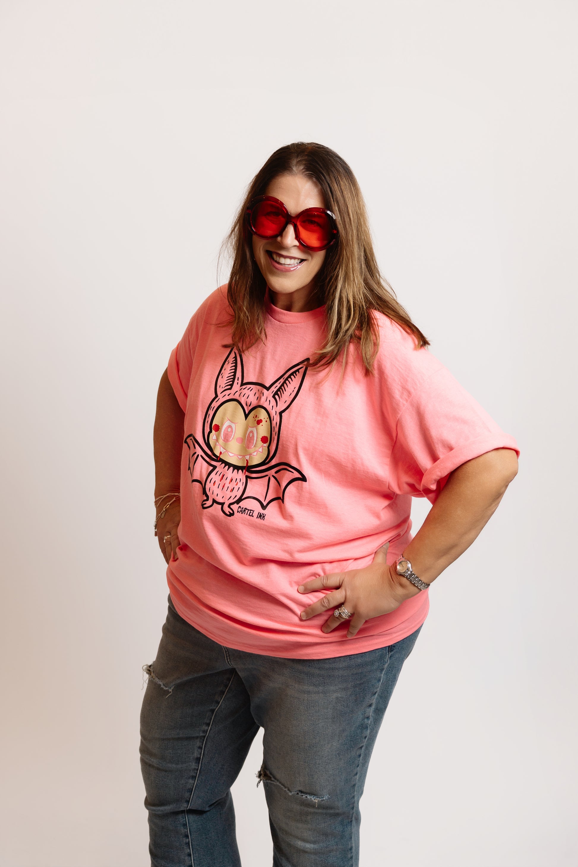 The Laboobat Tee is a playful short-sleeve, crew neck shirt featuring an adorable spooky Laboobat design. It's perfect for adding a touch of fun and whimsy to your Halloween!