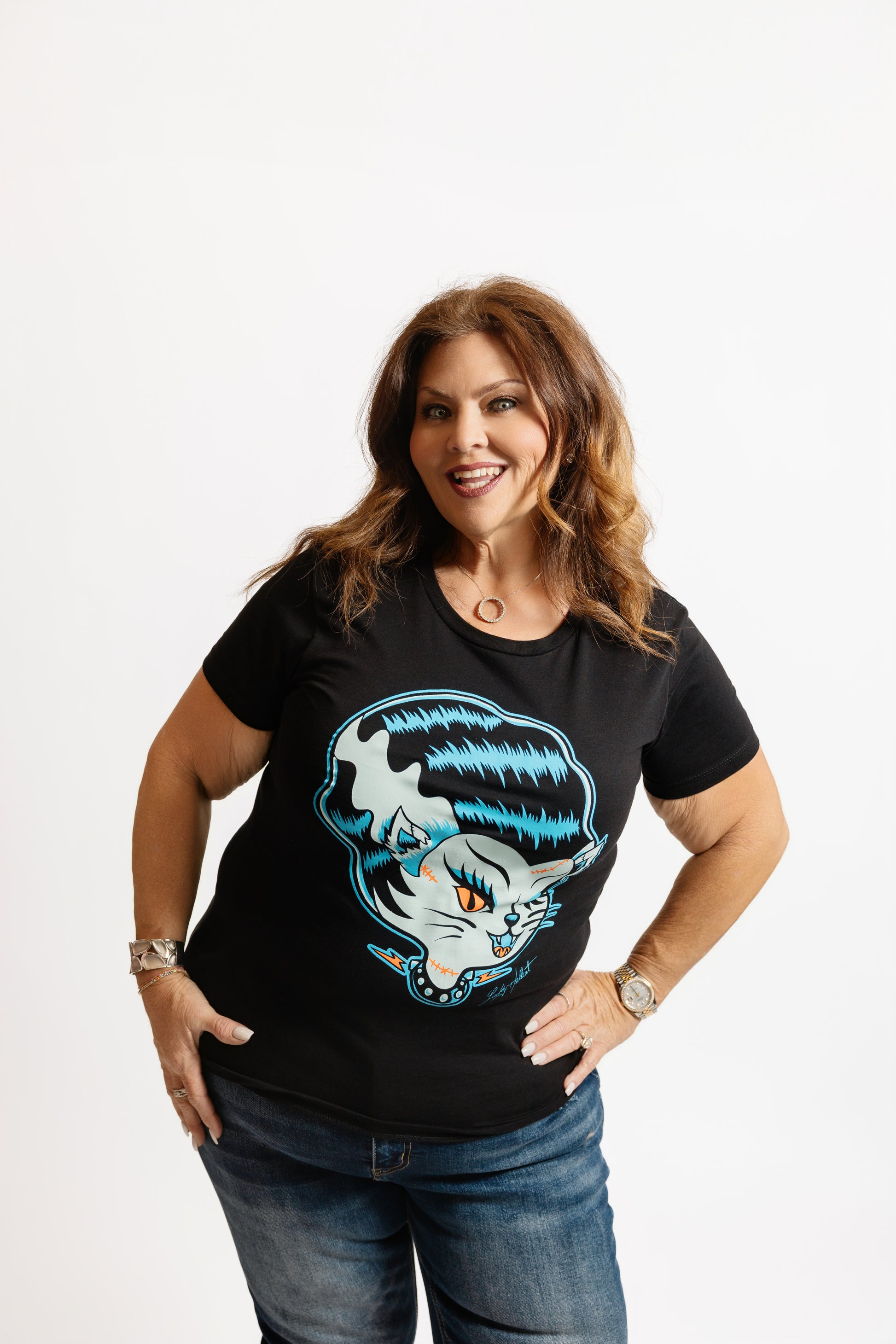 Embrace spooky vibes with the Hellcat Franken Kitten Tee, featuring a fierce Bride of Frankenstein kitty graphic. This playful short-sleeve, crew neck shirt blends edgy style with fun, making it perfect for showing off your festive spirit all day long.