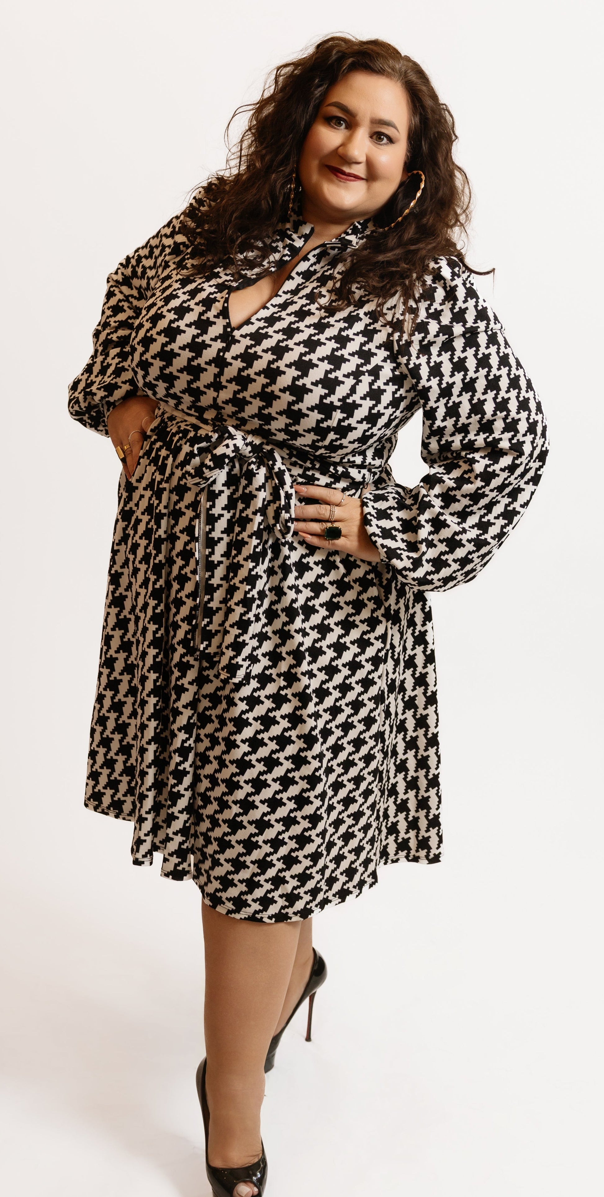 Step out in style with the Madison Houndstooth Dress, featuring a playful allover houndstooth print and a flattering fit-and-flare silhouette. The mock neckline and balloon sleeves add a fun twist, while the concealed zipper and removable tie sash offer easy wear and adjustable shape. With handy side pockets and a knee-length cut, this dress combines charm and practicality for any occasion.