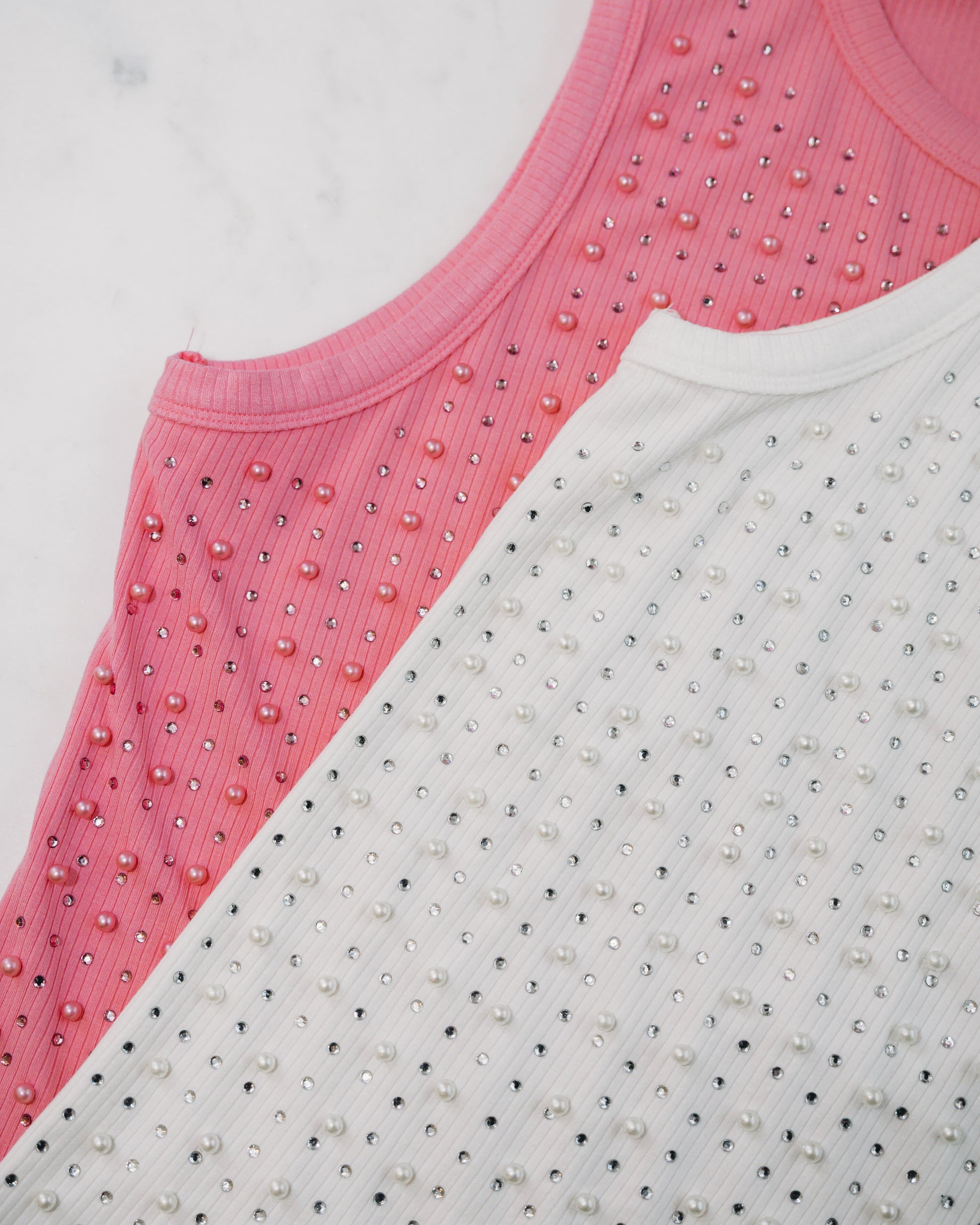 The Pearl Tank Top is the perfect blend of style and comfort. With a sleeveless design and round neck, it's perfect for any occasion. The elegant pearl beaded bodice adds a touch of sophistication, making it a versatile addition to your wardrobe.