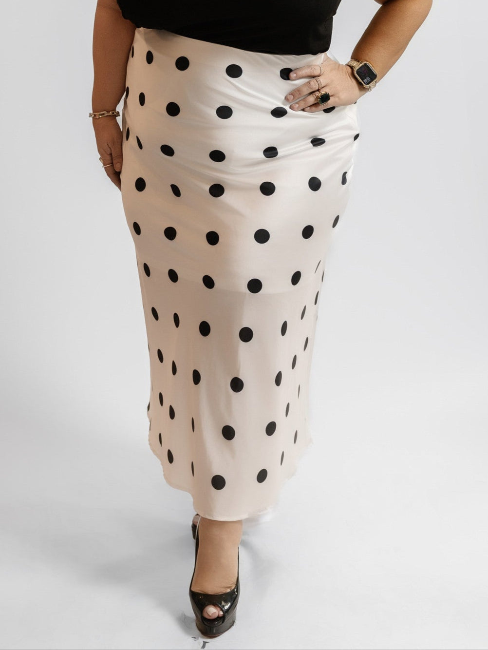 Crafted from white satiny fabric adorned with classic black polka dots, the Penny Polka Dot Skirt features a sleek mermaid silhouette that gracefully elongates the figure. This lined, long skirt includes a discreet side zipper for a smooth fit and comfortable wear. Its silky texture and timeless design make it an ideal choice for sophisticated occasions, balancing playful patterns with refined style.
