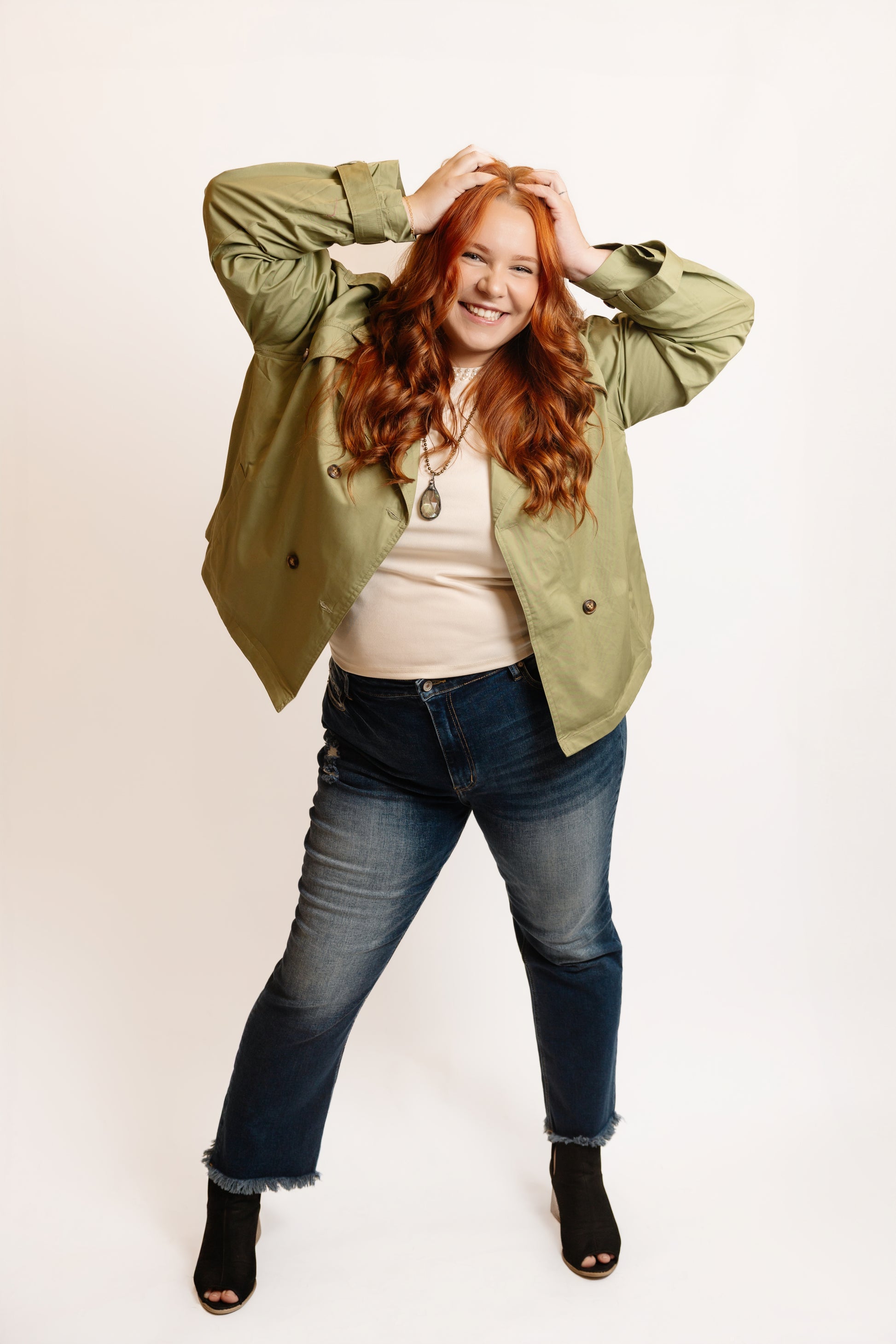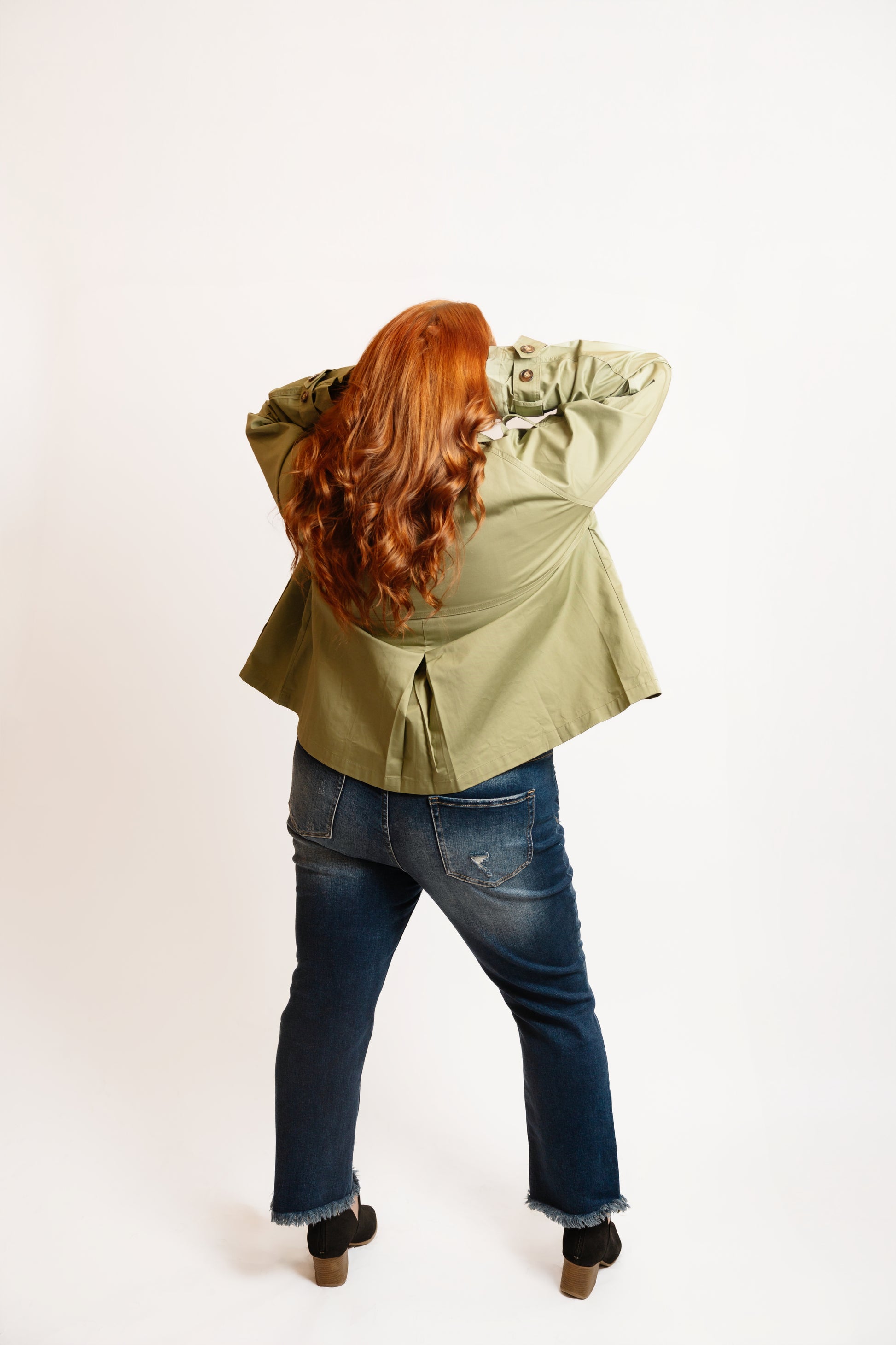Our trendy take on a classic trench coat! Amazing button and tie cuff details, side pockets and pleated back detail. Fully working buttons that can be fastened in the front. Boxy fit, slight crop.