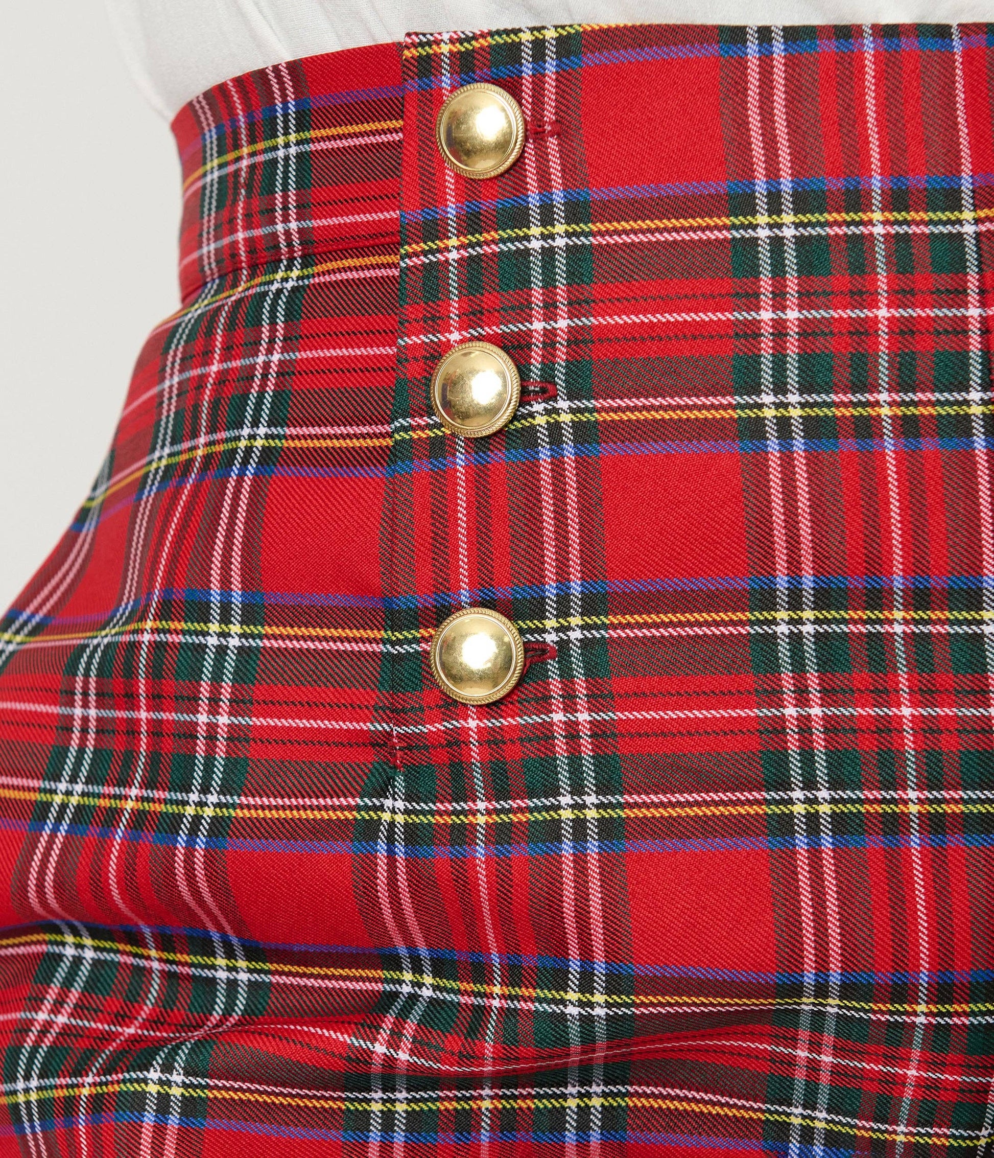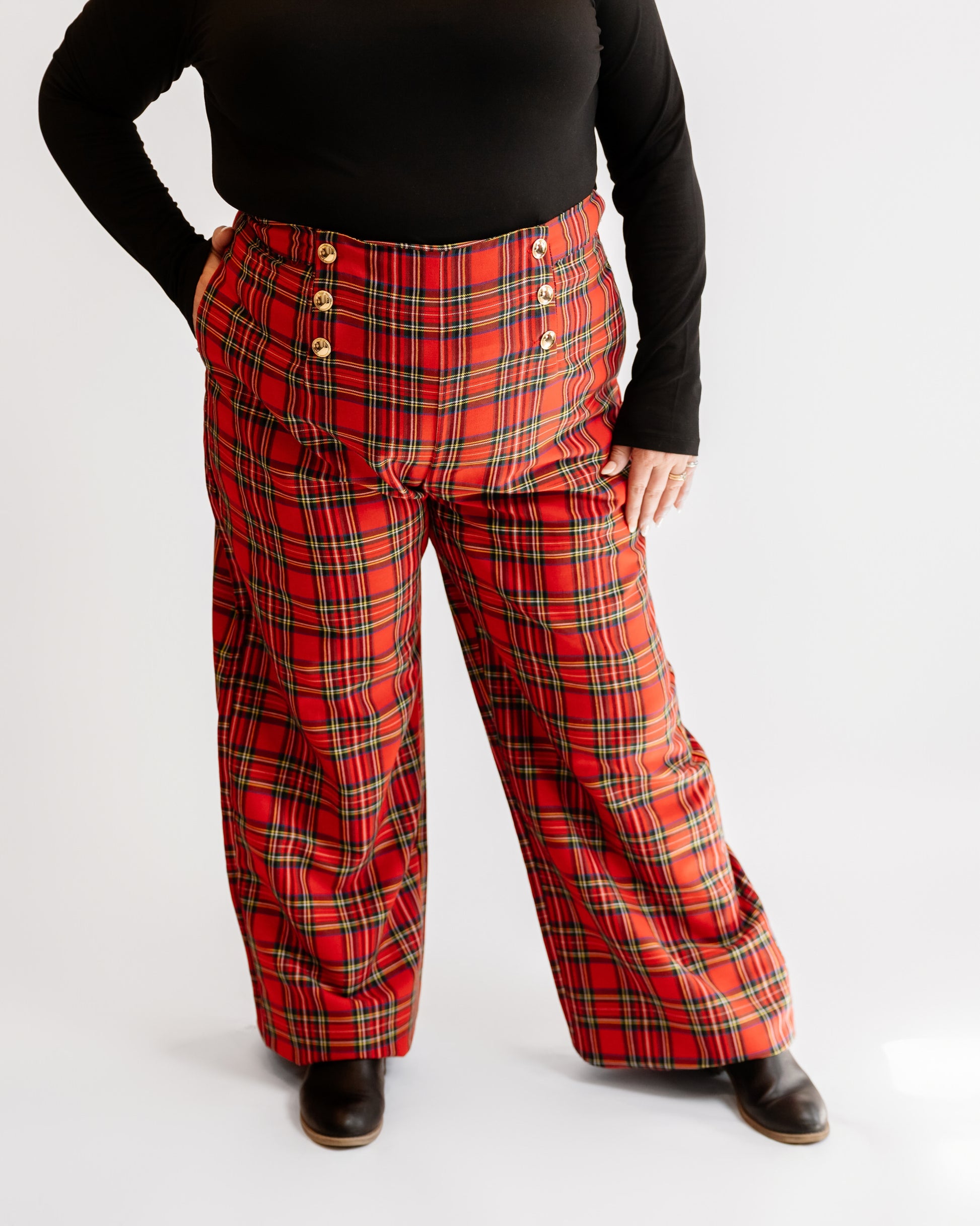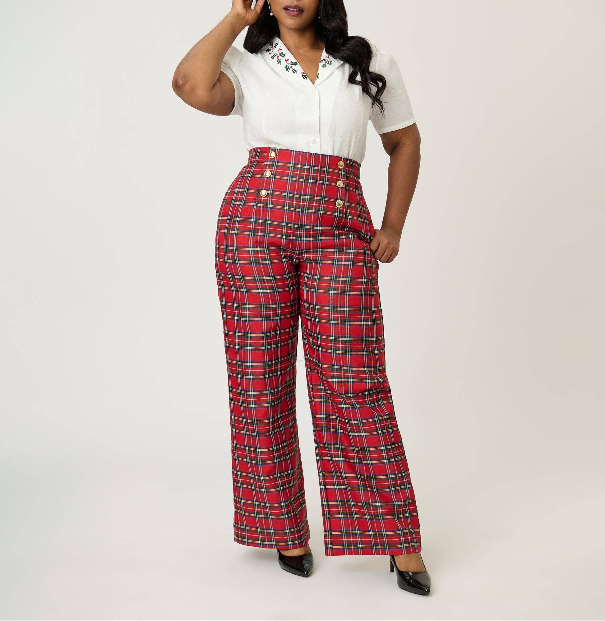 These chic pants combine the classic sailor aesthetic with a modern twist, featuring eye-catching faux silver buttons that add just the right amount of flair on the red plaid print. The wide leg design allows for easy movement, while handy side pockets keep your essentials close at hand. Plus, the sleek side zipper ensures a flattering fit every time you wear them.