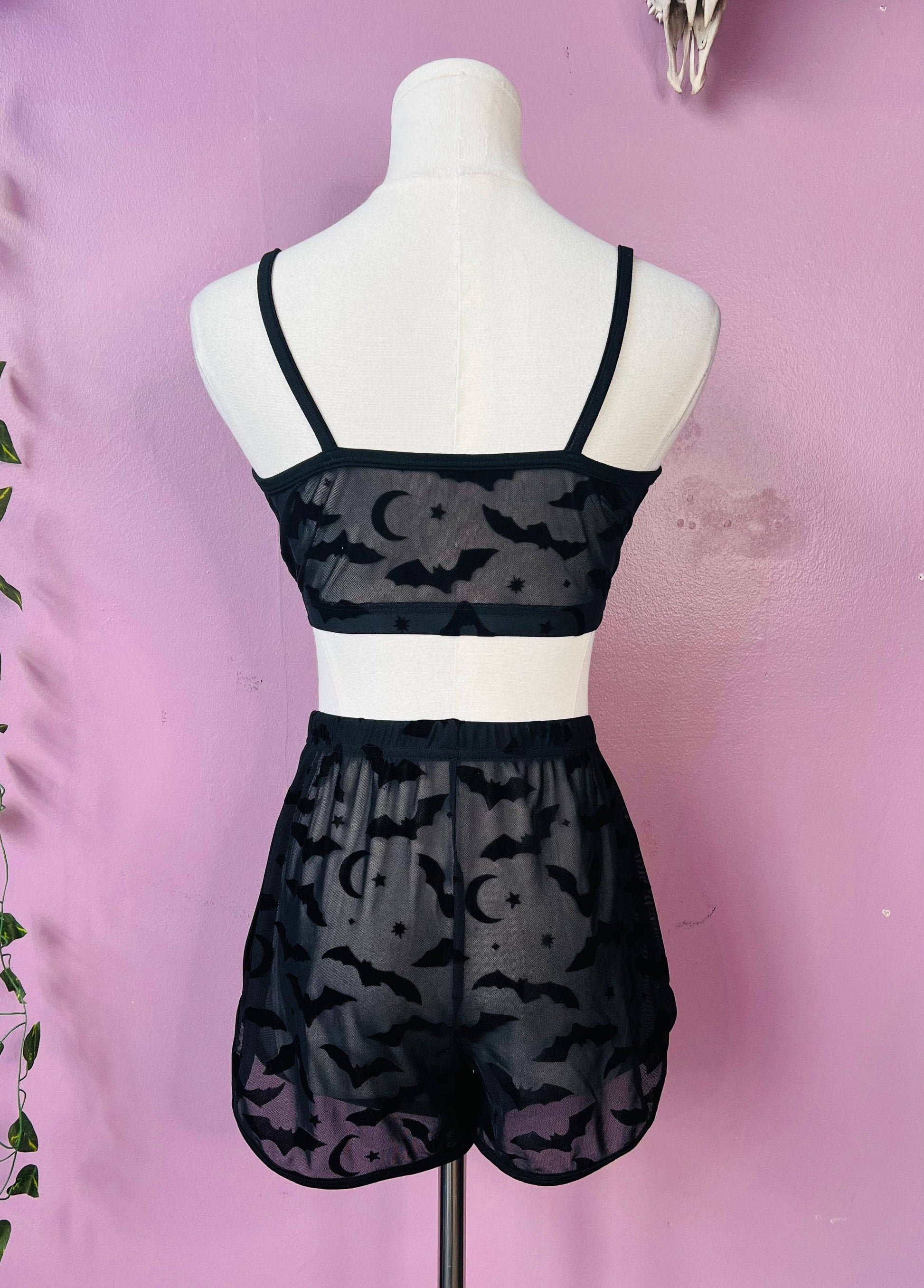 The Batty Set is sexy and hauntingly sheer! This bralette and shorts is super stretchy and comfy. Made from sheer mesh with velvet flock bat fabric.