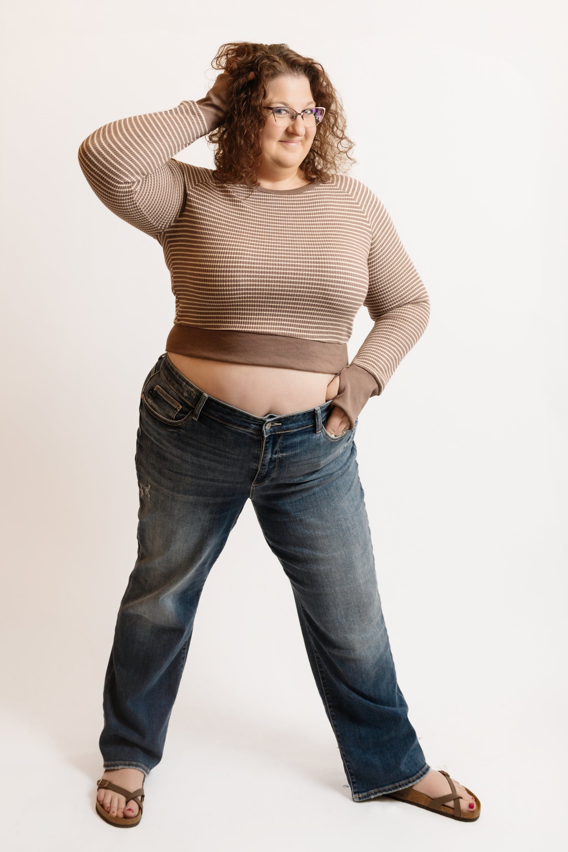 This playful striped waffle weave knit crewneck adds flair to your wardrobe with its flattering cropped fit and classic crew neckline. The soft, stretchy fabric keeps you comfy while thumbhole cuffs add a fun touch. Pair it with high-waisted jeans or your favorite bottoms for an effortlessly cool look.