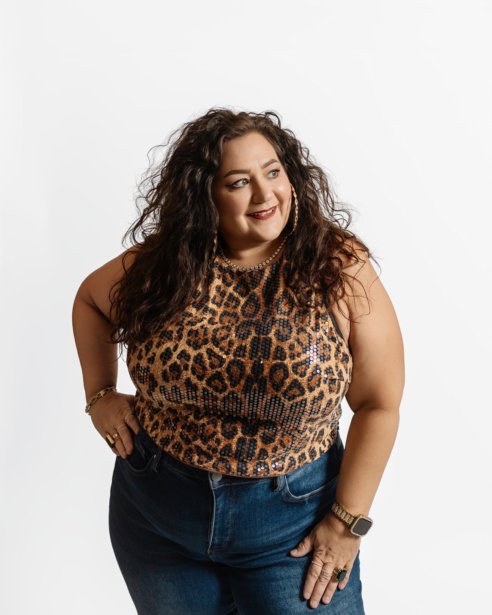 Make a bold statement with the Wilma Crop Top, featuring a daring sleeveless cut and a flirty keyhole button back. Fully lined for smooth comfort, this leopard print top sparkles subtly with clear sequins. Whether paired with jeans for an edge or dressed up for a night out, it’s your go-to for fearless style.